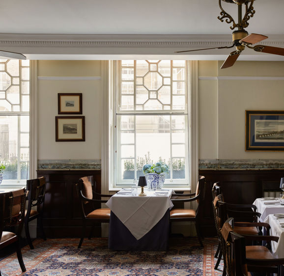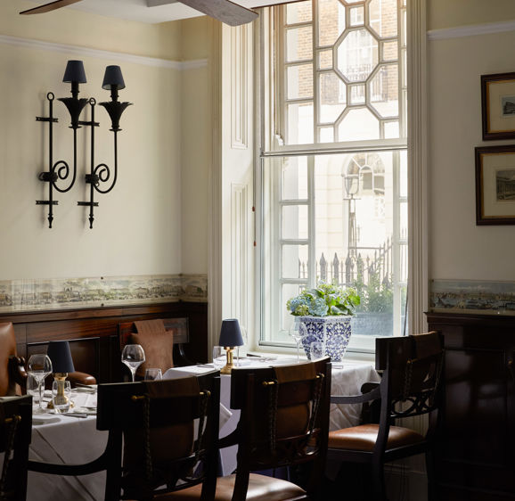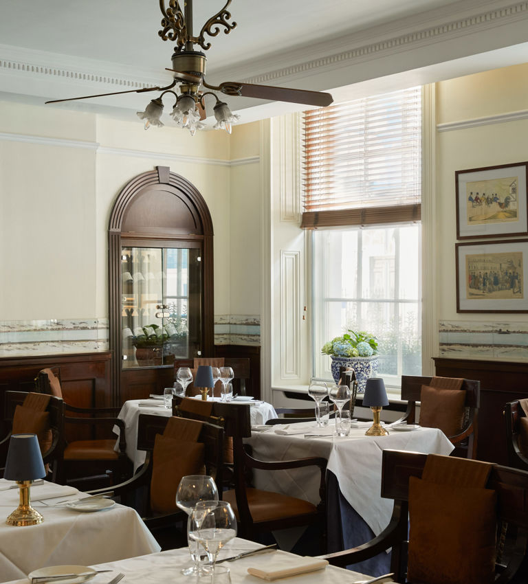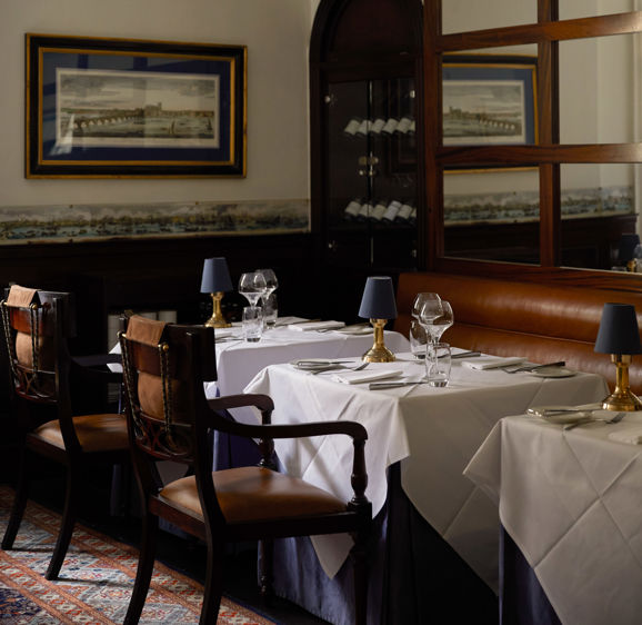 The Blue Door Bistro provides a welcoming and informal bistro-style setting, with a superb à la carte menu to match. Light and airy at lunchtime, warm and cosy by evening, the room is decorated on three sides with a panoramic view of London circa 1849. Together with the rich mahogany panelled walls, effective use of mirrored glass, and contemporary wrought iron wall lights, an ambience rooted in the hotel’s location is beautifully achieved.