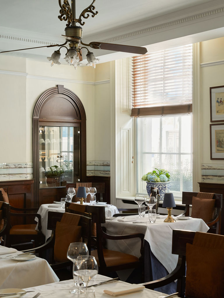 The Blue Door Bistro provides a welcoming and informal bistro-style setting, with a superb à la carte menu to match. Light and airy at lunchtime, warm and cosy by evening, the room is decorated on three sides with a panoramic view of London circa 1849. Together with the rich mahogany panelled walls, effective use of mirrored glass, and contemporary wrought iron wall lights, an ambience rooted in the hotel’s location is beautifully achieved.