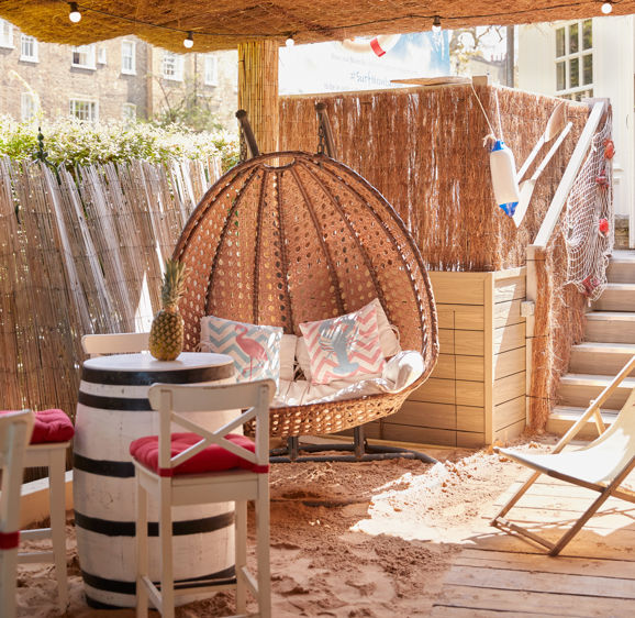 Experience an unforgettable summer party at the award-winning Beach Bar at The Montague on the Gardens. With real sand, a beach-hut style thatched roof, tropical palm trees, and a beautiful beach backdrop, you'll feel like you're basking in the Bahamas, right in the heart of London.